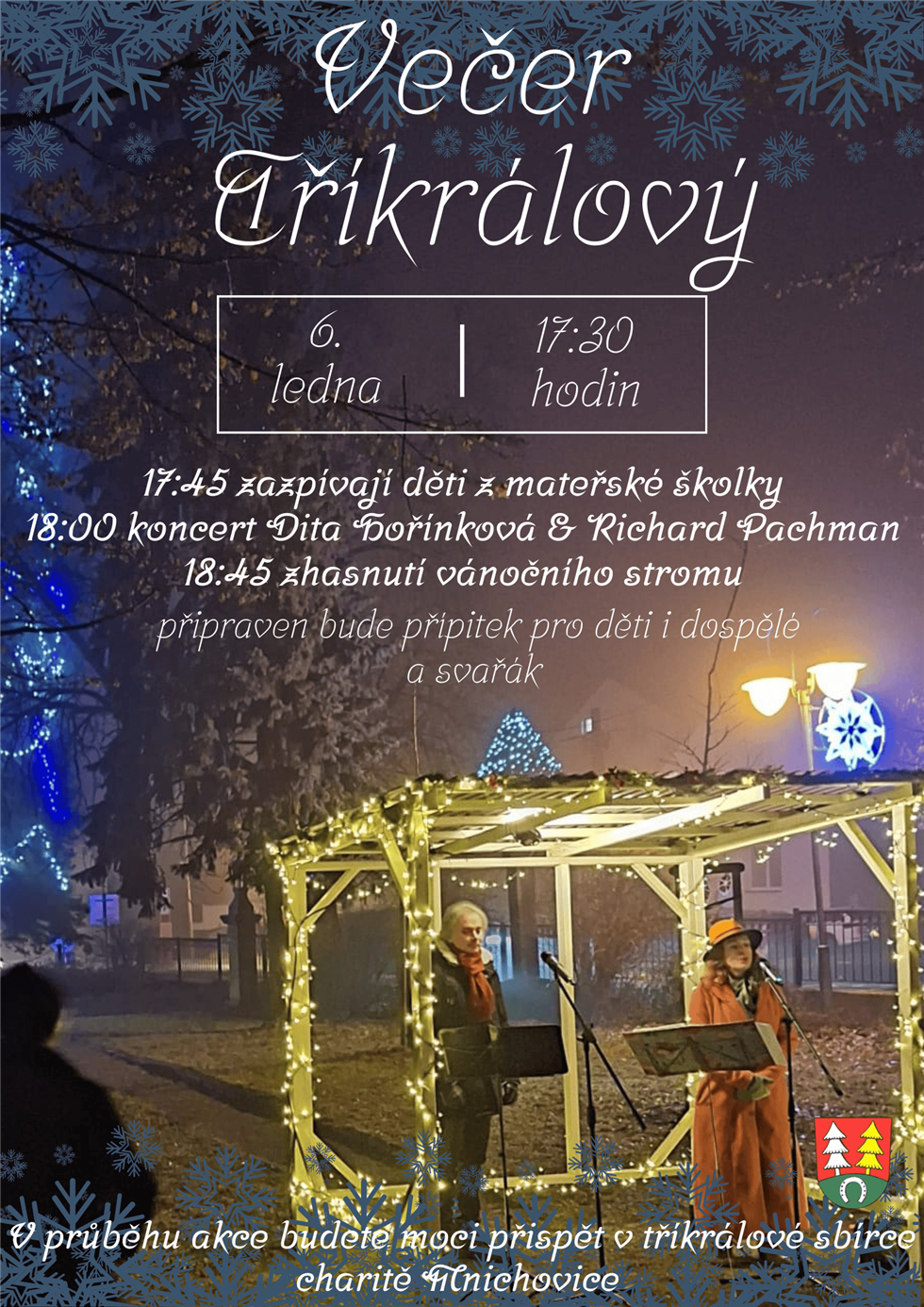 Stejně jako v předchozích letech bude tato událost plná krásné hudby a pohody, kterou přinesou talentovaní umělci pan Richard Pachman a paní Dita Hořínková. Těšit se můžete také na naše nejmenší zpěváčky z mateřské školky, kteří nám svým vystoupením uvedou celou akci.