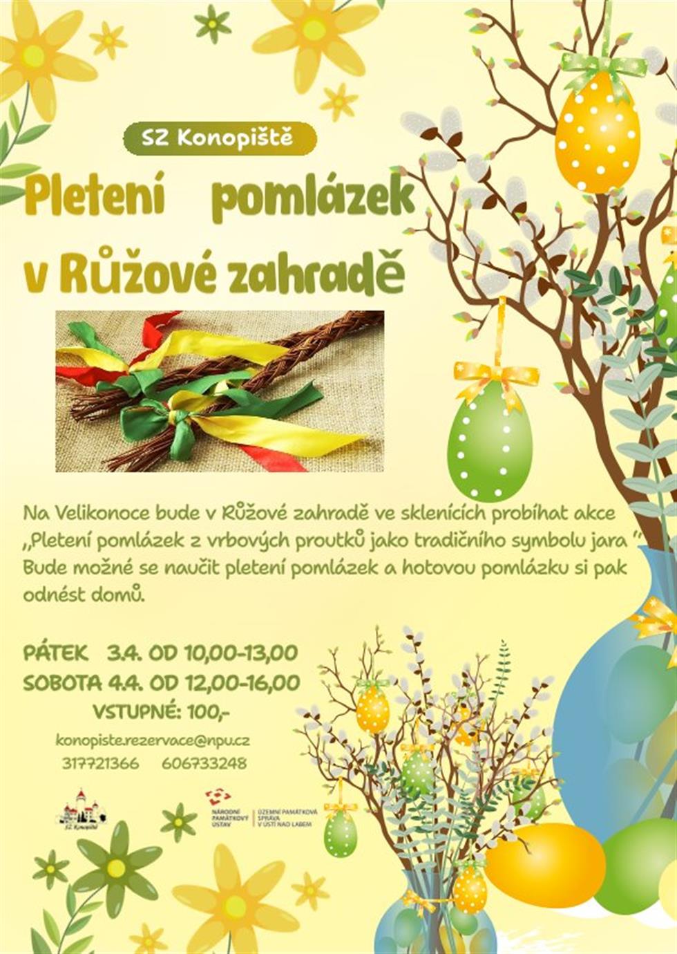 Na Velikonoce bude v Růžové zahradě ve sklenících rpobíhat akce "Pletení pomlázek z vrbových proutků jako tradičního symbolu jara." Bude možné se naučit pletení pomlázek a hotovou pomlázku si pak odnést domů.