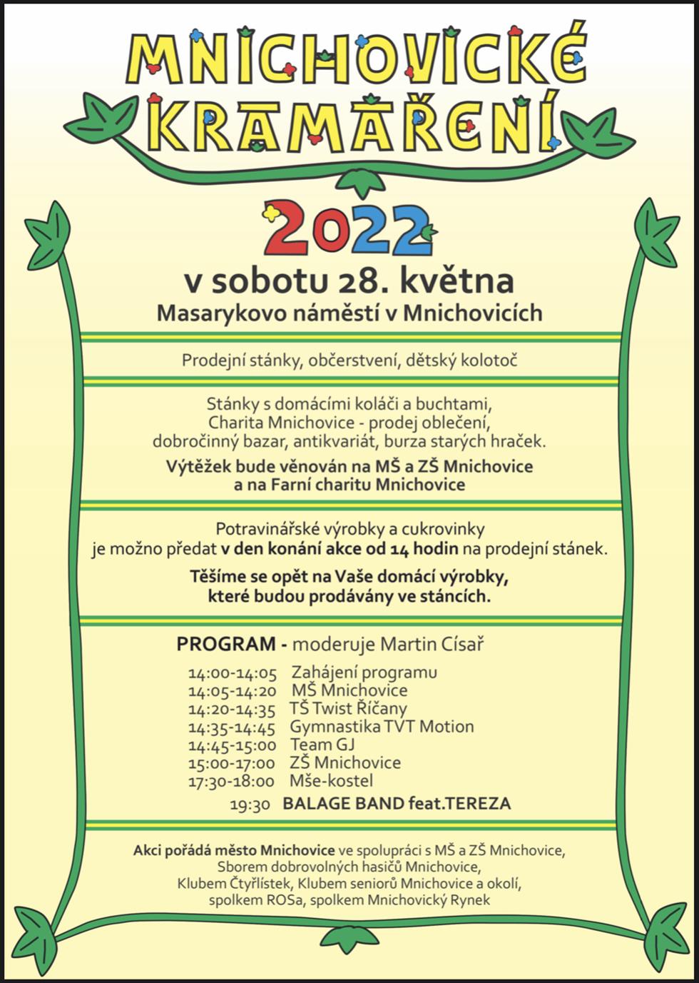 Program: moderuje Martin Císař14:00-14:05 Zahájení programu14:05-14:20 MŠ Mnichovice14:20-14:35 TŠ Twist Říčany14:35-14:45 Gymnastika TVT Motion14:45-15:00 Team GJ15:00-17:00 ZŠ Mnichovice17:30-18:00 Mše v kostele19:30 BALAGE BAND feat. Tereza
