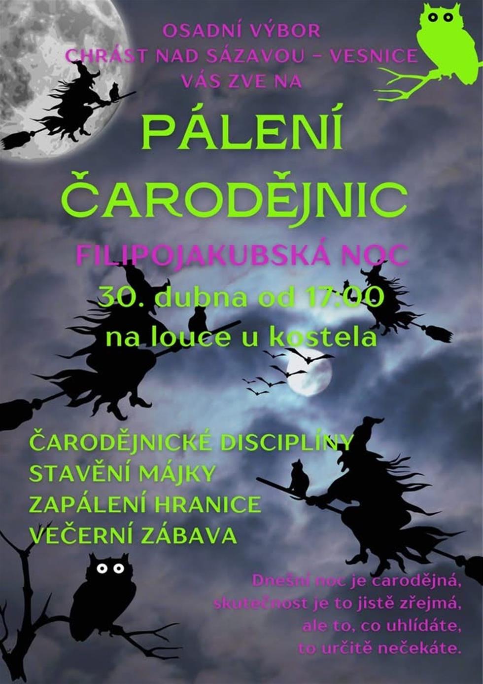 soutěžní disciplíny pro čarodějnicestavění májkyzapálení hranicevečerní zábavaPřijďte si užít příjemnou atmosféru a společně oslavit Filipojakubskou noc.